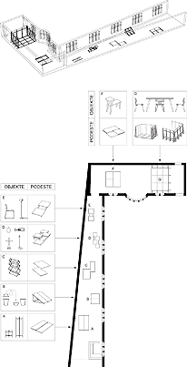 Eine Zonierung mittels Podesten - beschriftete Eternitplatten auf einfach gesteckten Unterkonstruktionen - soll helfen, die schwierigen räumlichen Verhältnisse zu bewältigen.Thematische Gruppen knüpfen Objekt-Beziehungen; einzelne Gegenstände sind in Bestandteile zerlegt und verweisen auf ihre Herstellung; Gebrauchszusammenhänge und räumliche Kontexte werden angedeutet; ungewöhnliche Blickwinkel eingenommen; das Prozesshafte in der Produktentwicklung - vom Modell zum fertigen Produkt - hilft, den Blick auf die Dinge zu schärfen.