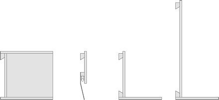 Das Wandregal besteht aus vier Systemelementen – Wandleiste, Tablar, Beleuchtungspanel und Kastenelement mit Schiebetüren. Diese Bausteine repräsentieren grundlegende Regalfunktionen: Arrangieren, Präsentieren, Beleuchten und Verstauen.