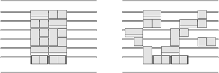 Alle Regalelemente werden in wandmontierte Holz-Leisten eingehängt und können so jederzeit neu gruppiert, verschoben und abgenommen oder in Zukunft um zusätzliche Elemente erweitert werden.