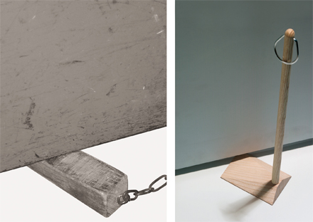 Rechts, ein Türkeil den wir für die Side by Side Kollektion der Caritas Werkstätten für behinderte Menschen entwickelt haben. Eine lange Griffstange schont den Rücken. Eine angemessen große Edelstahlspange erlaubt es, den Türkeil entweder direkt über eine Türklinke zu hängen oder aber ein Seil, eine Kette o.ä. daran zu befestigen.